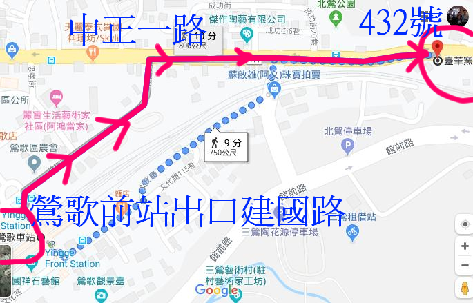 交通方面,若搭乘火車,步行約十分鐘,鶯歌前站建國路出站後,往右邊方向一直走,到中正一路繼續靠右走,就可以看到很大的招牌,請走到432號處進入,看到客用電梯後,進去按3樓,就是陶藝教室了。